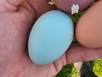 Looking for some dark chocolate brown eggs? Look no further! This group is a 50/50 blend between our French Blue and French Black Copper Marans. Chickens from this group can be blue, black, or a mix of the two or "splash". All hens from this group will produce standard to large chocolate brown eggs. Eggs are $4 each.